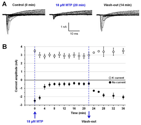 Patch-clamp experiments performed on Na and K currents of cultured N18 neuroblastoma cells reveal that MTP (0.9–18 µM) was effective to markedly block the Na current while being much less active on the K current, as illustrated in Figure 4A,B for 18 µM of peptide. The effects of MTP were time dependent and occurred within 4 min after cell perfusion with 18 µM of the peptide (Figure 4B). They were almost completely reversed by the wash-out of the peptide for periods up to 14 min (Figure 4A,B). Hence, the peak Na and steady-state K current amplitudes, which were decreased to 17.49 ± 6.83% and 85.36 ± 10.12% (n = 2), respectively, by 18 µM MTP, recovered to 82.74 ± 1.34% and 100.13 ± 0.89% (n = 2), respectively, after wash-out when compared to values determined before cell exposure to the peptide.