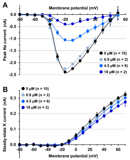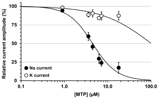 To further study the mode of action of MTP on Na and K currents, the current-voltage relationships were established in the absence (0 µM) and in the presence of 0.9–18 µM of peptide (Figure 6). In addition to confirm that MTP was more active to decrease the peak Na than the steady-state K current amplitude, these results reveal that no significant shift of the curves were detected along the voltage axis, whatever the peptide concentration was between 0.9 and 18 µM (n = 2–10). Knowing that the activation (opening, i.e., the transition between resting/closed and activated/open states) of voltage-gated Na and K channels are controlled by gating systems that depend on both membrane potential and time [24], this indicates that MTP did not affect the voltage dependence of activation of channels.