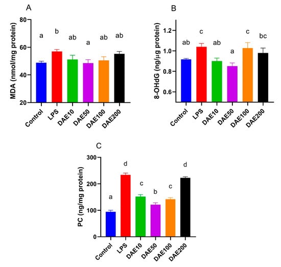 Figure 2. Effects of lipopolysaccharide (LPS) and dandelion aqueous extract (DAE) on the concentrations of oxidative damage markers, including malondialdehyde (MDA) (A), 8-hydroxy-2′-deoxyguanosine (8-OHdG) (B), and protein carbonyl (PC) (C) in MAC-T cells. Columns without a common lowercase letter (a, b, c, d) indicate significant difference among treatments (p < 0.05). LPS: 100 ng/mL LPS; DAE10: 100 ng/mL LPS and 10 μg/mL DAE; DAE50: 100 ng/mL LPS and 50 μg/mL DAE; DAE100: 100 ng/mL LPS and 100 μg/mL DAE; DAE200: 100 ng/mL LPS and 200 μg/mL DAE.