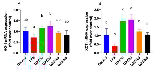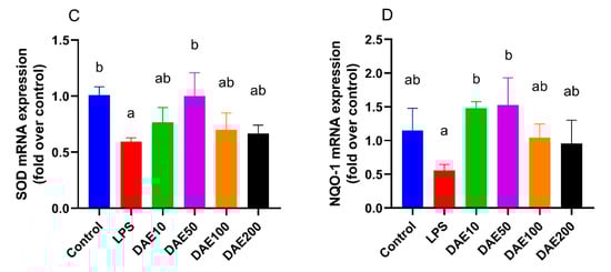 2.5. Effects of LPS and DAE on the mRNA Expression of Antioxidative Genes