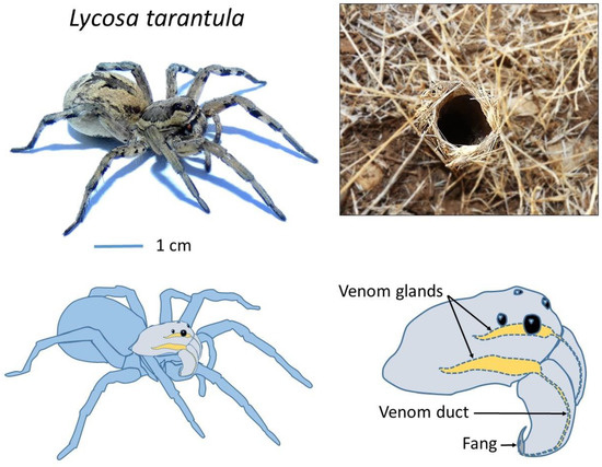 Whereas many araneomorph spiders have evolved web-building skills to facilitate prey capture, some remain active hunters and rely on speed and fast acting venom to subdue their prey. From this latter group, the wolf spiders (Lycosidae) are widely distributed across the globe, with more than 2300 species described [13]. Lycosa tarantula is one of the largest representatives of the Lycosidae family in the Mediterranean basin [14], reaching a body length of 30 mm. It lives in burrows up to 40 cm deep, which end with a “turret” made of twigs, plant debris and small pebbles agglomerated with silk (Figure 1). From this burrow, the spider will ambush passing prey. It is found in southern Europe, including France, but also Italy, where this legendary spider was wrongly held responsible for the “tarantism”. A bite from this “tarantula” was supposed to cause a state of lethargy that may lead to death, and affected victims had to dance the “tarantella” if they were to survive [15]. It was later suggested that the true culprit was likely the local black widow (Latrodectus tredecimguttatus). Remarkably, although locally common in Mediterranean regions and relatively large, the venom of L. tarantula is still mostly unknown. Despite being considered harmless to humans, early experiments from naturalist Jean-Henri Fabre demonstrated that its venom can have deleterious effects on small vertebrates [16]. Indeed, a young sparrow and a mole bitten by an adult L. tarantula would both succumb to the effect of its venom in less than 48 h, suggesting that this species should be handled carefully.