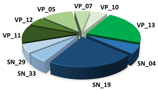 Representation of the 10 families of toxins (SN) and venom proteins (VP) from the venom gland transcriptome of L. tarantula.