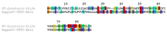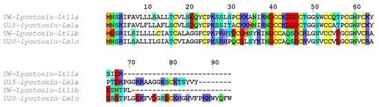 One sequence (U1-lycotoxin Lt04a) exhibited high identity (93%) with U2-lycotoxin-Ls1b from the related Lycosa singoriensis (Figure 3). Both signal peptides (1–18) were identical, whereas the propeptide contained five substitutions that were mostly conservative (e.g., E to D or V to L). The predicted mature toxin (cleavage after residue 42) contained eight cysteine residues arranged in a CX6CXCX6CXCX11CXCX13C pattern and showed only two substitutions compared to U2-lycotoxin-Ls1b, namely F72 to L and a charge inversion K80 to E. The biological activity of these toxins is unknown.