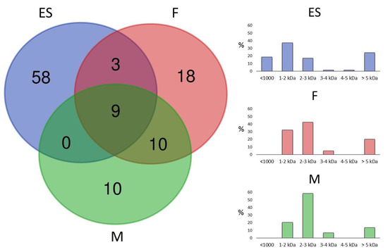 Venn diagram and mass distribution of electrically stimulated (ES), female (F), and male (M) L. tarantula venom. (Left) panel shows the overlap of masses between venom samples. (Right) panels show the mass distributions for each venom sample.