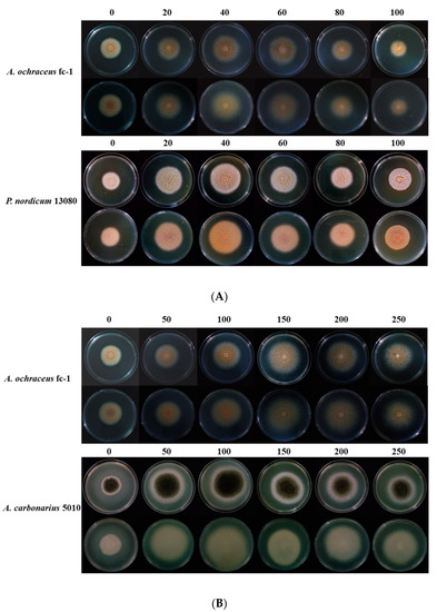 The colony of A. ochraceus fc-1, A. carbonarius 5010, P. nordicum 13080 after 4 days of incubation at 28 °C: (A) Colonies of A. ochraceus fc-1 grown on 0, 20, 40, 60, 80, 100 g/L NaCl-supplemented Potato Dextrose Agar (PDA) plates. Colonies of P. nordicum 13080 grown on NaCl-supplemented Malt Extract Agar (MEA) plates. (B) Colonies of A. ochraceus fc-1 grown on 0, 50, 100, 150, 200, 250 g/L glucose-supplemented PDA plates. Colonies of A. carbonarius 5010 grown on glucose-supplemented Yeast Extract Sucrose Agar (YES) plates.
