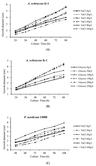 The effect of NaCl on P. nordicum 13080 is consistent with A. ochraceus fc-1 (Figure 2C). Low concentrations of NaCl promoted the growth of P. nordicum 13080. When 40 g/L NaCl was added, the diameter of the colony was 41.4% larger than that of the control group without NaCl. When 80 g/L NaCl was added, the growth rate of mycelia was reduced during the first three days of the culture; however, the growth rate of mycelia was still 2.2% larger than that of the control on the fifth day. When 100 g/L NaCl was added, the diameter of the colony was 13.9% smaller than that of the control group without NaCl (Figure 2C).