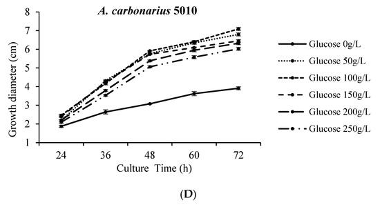 With the addition of glucose at 0–200 g/L, the growth of hyphae was gradually accelerated (Figure 2B). With the addition of 150 g/L glucose, the growth rate of hyphae was the highest. The colony diameter was 61.4% larger than that of the control group without glucose. With the addition of 250 g/L glucose, the growth rate of mycelia was weakened, while the colony diameter was still 4.8% larger than that of the control group (Figure 2B).