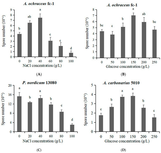 Spore production of A. ochraceus fc-1, A. carbonarius 5010 and P. nordicum 13080. (A) Spores were collected from A. ochraceus fc-1grown on 0, 20, 40, 60, 80, 100 g/L NaCl-supplemented PDA plates; (B) Spores were collected from A. ochraceus fc-1grown on 0, 50, 100, 150, 200, 250 g/L glucose-supplemented PDA plates; (C) Spores were collected from P. nordicum 13080 grown on NaCl-supplemented MEA plates; (D) Spores were collected from A. carbonarius 5010 grown on glucose-supplemented YES plates. Different letters indicate a significant difference between the corresponding values (p < 0.05).