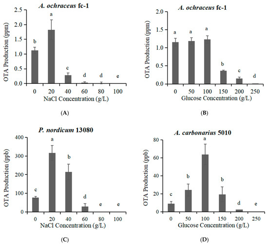 The Ochratoxin A (OTA) production of A. ochraceus fc-1, A. carbonarius 5010 and P. nordicum 13080 after 5 days of incubation. (A) The OTA production of A. ochraceus fc-1grown on NaCl-supplemented PDA plates; (B) The OTA production of A. ochraceus fc-1grown on glucose-supplemented PDA plates; (C) The OTA production of P. nordicum 13080 grown on NaCl-supplemented MEA plates; (D) The OTA production of A. carbonarius 5010 grown on glucose-supplemented YES plates. Different letters indicate a significant difference between the corresponding values (p < 0.05).