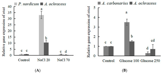 The relative expression level of OTA biosynthetic genes AootaA in A. ochraceus fc-1, AcotaA in A. carbonarius 5010 and PnotaA in P. nordicum 13080 at high osmotic conditions after 5 days of incubation. (A) The relative expression level of otaA on NaCl-supplemented medium; (B) The relative expression level of otaA on glucose-supplemented medium. Different letters indicate a significant difference between the corresponding values (p < 0.05).
