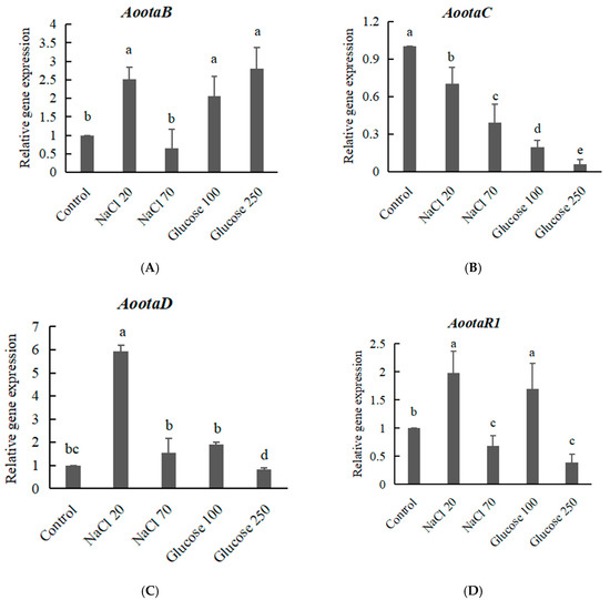 The expressional profile of biosynthetic genes (otaA-D) and regulatory gene (otaR1) was different under different osmotic stress. Except the AootaC gene, the expression level of AootaA, AootaB, AootaD and AootaR1 was increased 10.5, 2.5, 5.9, 2.0 times higher in A. ochraceus at mediun supplied with 20 g/L NaCl than that of the control group without NaCl (Figure 5A and Figure 6B–D). When 70 g/L NaCl was added, the expression level of AootaA, AootaB, AootaC and AootaR1 was 0.4, 0.6, 0.4 and 0.7 times lower than that of the control group without NaCl (Figure 5A and Figure 6A,B,D). The expression level of AootaD was still 1.5 times higher than that of the control group (Figure 6C).