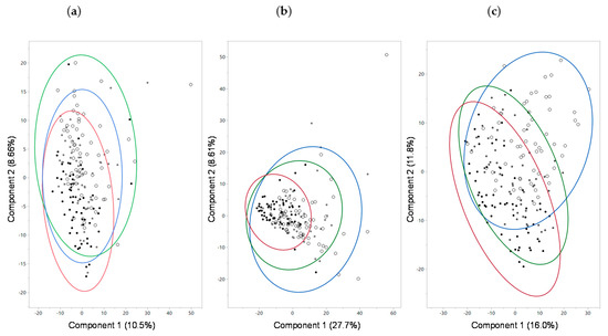 Principal components (PC) analysis for metabolomics data from (a) serum, (b) urine, and (c) feces from dogs fed food containing high (black dots), medium (gray dots), or low (white dots) levels of protein. Red, green, and blue circles indicate 95% confidence intervals for the high, medium, and low protein foods, respectively. For (a), effects on PC1 were significant between medium and high protein foods (p = 0.0003) and low and medium protein foods (p = 0.0008); effects on PC2 were significant between medium and high protein foods (p < 0.0001) and low and medium protein foods (p < 0.0001). For (b), effects on PC1 were significant between low and high protein foods (p < 0.0001); effects on PC2 were significant between low and high protein foods (p = 0.03). For (c), effects on PC1 were significant between low and high protein foods (p < 0.0001); effects on PC2 were significant between low and high protein foods (p < 0.0001).