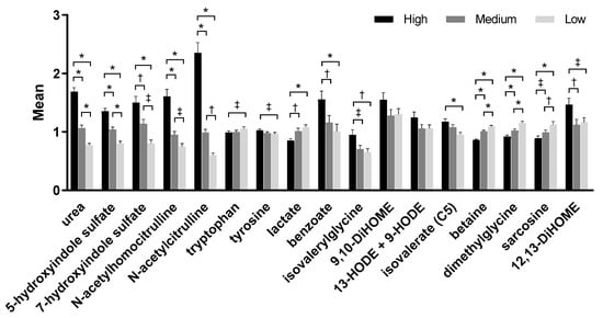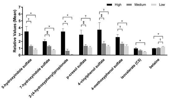 Metabolite analyses from urine samples of dogs fed the high, medium, and low protein foods. Data were rescaled to a median value of 1 and are presented as group means and standard errors. Significance was determined using one-way ANOVA followed by a post hoc Tukey’s test. * p ≤ 0.001; † p ≤ 0.01; ‡ p ≤ 0.05.