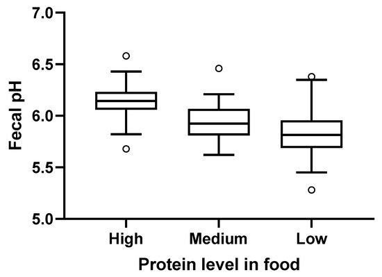 Fecal pH levels from dogs fed the high, medium, or low protein foods. Lines within the boxes indicate the median pH; tops and bottoms of the boxes represent the upper and lower quartiles, respectively. Circles represent the minimum and maximum values.