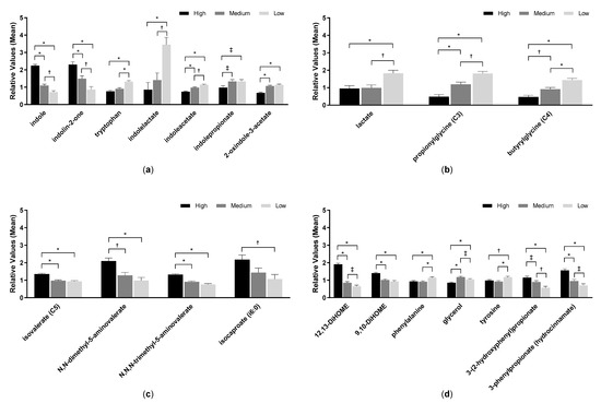 Metabolite analyses from fecal samples of dogs fed the high, medium, and low protein foods; (a) indoles, (b) short-chain fatty acids, (c) branched-chain fatty acids, and (d) other metabolites. Data were rescaled to a median value of 1 and are presented as group means and standard errors. Significance was determined using one-way ANOVA followed by a post hoc Tukey’s test. * p ≤ 0.001; † p ≤ 0.01; ‡ p ≤ 0.05. Levels of short-chain fatty acids (SCFAs), which generally confer beneficial effects on health, decreased with increased protein consumption (Figure 5b, Table S3), while BCFAs increased with increased protein consumption (Figure 5c, Table S3).