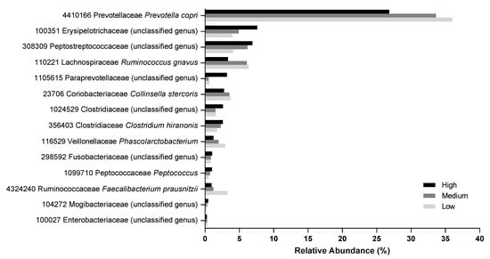 The fecal microbiome analysis was performed as previously described [10], except that total DNA was extracted from frozen feces samples using the Qiagen MagAttract Power Microbiome DNA/RNA EP DNA isolation kit (Qiagen Cat. No. ID:27500-4-EP, Germantown, MD, USA) optimized for use with the Eppendorf epMotion 5075 TMX platform (Eppendorf, AG, Hamburg, Germany). In brief, PCR amplification spanned the V3–V4 hypervariable regions of the 16S rRNA gene, amplicon sequencing was performed using the Illumina library preparation protocol (15044223 Rev. A) and sequences were de-multiplexed to obtain FASTQ Files. Sequences with a quality score (Q30) above 80% were selected. FASTQ files were then pre-processed into contigs from pairs of reads, chimeras were removed, and Mothur software (University of Michigan, Ann Arbor, MI, USA) was used to obtain bacterial taxonomic classification per the GreenGenes reference taxonomy at the genus level. OTUs were identified based on taxonomic hierarchy and were further processed using the PICRUSt protocol to correct for copy numbers of the 16S genes in their respective taxa. Samples with <5000 reads were removed from the analysis. Sequences were deposited in the NCBI Sequence Read Archive under Accession No. PRJNA649283.4.6.