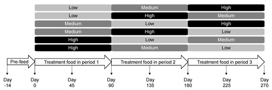 For 14 days, all dogs were maintained on Hill’s® Science Diet® Canine Maintenance® containing 230 g/kg crude protein (major protein source: chicken), 134.9 g/kg crude fat, 49.9 g/kg ash, 180 g/kg crude fiber, and 86.0 g/kg moisture. Dogs were then randomly assigned to one of the six different groups of five dogs each (Figure 7). Age and gender were balanced across the groups. Each group consumed one of the low, medium, or high protein foods for 90 days followed by the other treatment foods in a distinct sequence following the Williams Latin Square Design [48]. Dogs were fed from electronic feeders, where fresh food was offered once a day with amounts calculated to maintain body weight. Blood, urine, and fecal samples were collected at the end of the pre-feed period as well as approximately on days 45 and 90 of each treatment period. Body weight and levels of metabolites and microbial composition were assessed at the end of each 90-day feeding period. All dogs were assessed to be healthy at the end of the study.