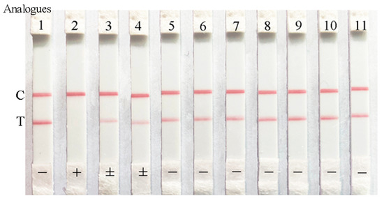 The cross-reactivity tests of the ICA for ZEN detection. The analogs were 5 ng/mL. (1) negative; (2) ZEN; (3) α-Zearalenol; (4) β-Zearalenol; (5) α-Zearalanol; (6) β-Zearalanol; (7) Zeranol; (8) Aflatoxin B1; (9) Deoxynivalenol; (10) Fumonisin B1; (11) Ochratoxin A.