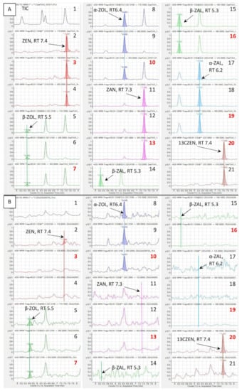 Typical chromatograms obtained using method 1. (A) Liver sample obtained from a turkey fed a diet free of ZEN, spiked after extraction with 25 ng/mL equivalent to 1 ng/g of each analyte. (B) Liver sample obtained from a turkey fed a diet containing ZEN at a concentration of 470 µg/kg for 14 days, spiked with 2.5 ng [13C18]-ZEN/g (13CZEN). 1: Total ion chromatogram (TIC); 2–21: ion masses, quantifiers are red typed; 2: 115; 3: ZEN 128; 4: 283.2; 5: 115.1; 6: 285.3; 7: 303.3; 8: 115.1; 9: 285.3; 10: 303.3; 11: 123; 12: 189.2; 13: 303.2; 14: 123.2; 15: 189.1; 16: 305.3; 17: 123.1; 18: 189.1; 19: 305.2; 20: 199.1; 21: 319.2.