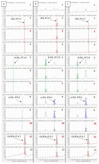 Typical chromatograms obtained from liver spiked with 2.5 ng [13C18]-ZEN/g (13CZEN) using method 2. Sample obtained from a turkey fed a diet free of ZEN (A) and spiked with 1 ng/g of each analyte (B). (C) Sample obtained from a turkey fed a diet containing ZEN at a concentration of 470 µg/kg for 14 days. 1: Total ion chromatogram (TIC); 2–12: ion masses, quantifiers are red typed; 2: 115; 3: 128; 4: 283.2; 5: 115.1; 6: 285.3; 7: 303.3; 8: 115.1; 9: 285.3; 10: 303.3; 11: 199.1; 12: 319.2.