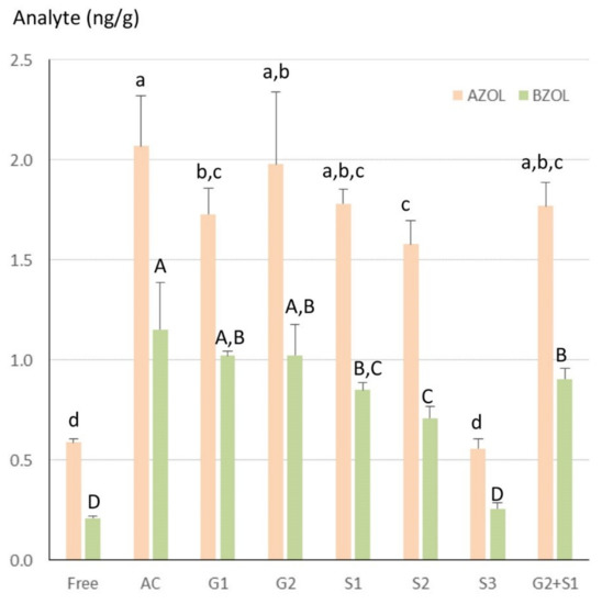 Amount of free and total α-ZOL and β-ZOL measured in a homogenate of livers obtained from turkeys fed a diet containing ZEN at a concentration of 470 µg/kg for 14 days. Results are expressed as mean ± SD of 5 determinations. Free = control, without hydrolysis of the conjugated forms, AC = acid hydrolysis, G1 = type H-1 β-glucuronidase from Helix pomatia, G2 = type H-2 β-glucuronidase from Helix pomatia, S1 = type H-1 sulfatase from H. pomatia, S2 = type H-2 sulfatase from H. pomatia, S3 = type VI sulfatase from Aerobacter aerogenes. A between-group statistical difference was found (ANOVA). Different letters (a,A,b,B,c,C) indicate statistical differences between groups.