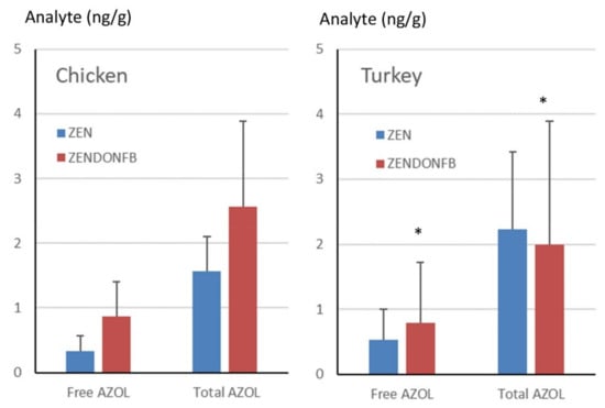 The amounts of free and total α-ZOL found in the livers of turkeys and chickens fed the contaminated diets are compared in Figure 4. In turkeys, free α-ZOL represented 24% of the total forms in animals fed the ZEN diet and 40% in animals fed the ZENDONFB diet, but this difference was not statistically significant. In chickens, the free forms of α-ZOL represented 21% of the total forms in animals fed the ZEN diet and 33.7% in animals fed the ZENDONFB diet (Figure 4). This difference was significant (ANOVA, p = 0.039), suggesting that the increase in the concentration of α-ZOL observed in the livers of chickens fed DON and FB was more pronounced for the free forms than for the conjugated forms. Comparison cannot be done for β-ZOL as only three samples in turkeys and four samples in chickens showed concentrations of the free forms above the LOQ.