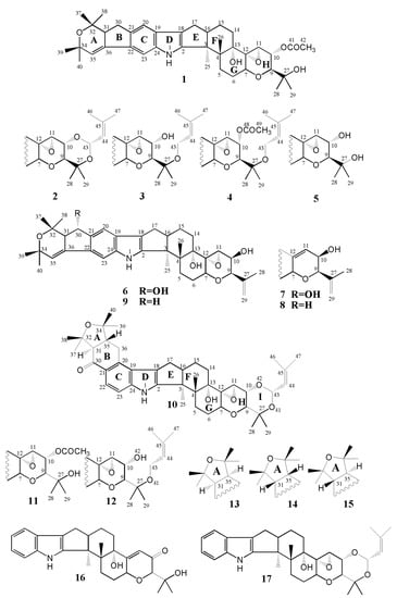 Structures of epoxyjanthitrems I–IV (1–4), epoxyjanthitriol (5), janthitrem A (6), janthitrem B (7), janthitrem C (8), janthitrem D (9), lolitrem B (10), lolitriol acetate (11), lolitrem E (12), lolitrem F (13), 31-epi-lolitrem B (14), 31-epi-lolitrem F (15), paxilline (16) and terpendole C (17). Note that the numbering system used in this study is one modified by Miles et al. [27] and Babu et al. [24] rather than that used previously for janthitrem compounds [28] to allow direct comparison of NMR chemical shifts of related indole-diterpenoids.