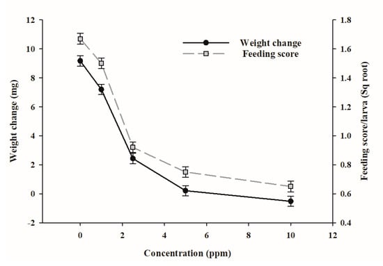 The feeding score data were normalised by square root transformation before a repeated measures analysis was carried out using REML with treatment and date as factors. The daily webbing score and weight change of larvae over 7 days were analysed using ANOVA, blocked by replicate, to make pairwise comparisons for each concentration with the solvent control at each date.