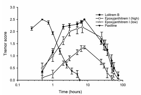 Pure lolitrem B and paxilline were obtained using the methods detailed Miles et al. [31] and Munday-Finch et al. [40], respectively. Epoxyjanthitrem I, lolitrem B and a related indole-diterpene, paxilline [41] (Figure 1) were administered by intraperitoneal injection as DMSO/water solutions (9:1, 50 µL) into mice (Swiss, female, weight 25 ± 3g). Control mice were injected with the solvent alone. Dose rates which induce an acceptable maximum tremor response are well established for lolitrem B [42] (2 mg/kg) and paxilline [27] (6 mg/kg). A starting dose rate of 8 mg/kg was used for epoxyjanthitrem I, which gave only a low tremor response; a dose rate of 14 mg/kg was therefore subsequently used for the experiment. Groups of four mice were used for each treatment group. All animal manipulations were approved by the AgResearch Ruakura (Hamilton, New Zealand) Animal Ethics Committee established under the Animal Protection (code of ethical conduct) Regulations Act, 1987 (New Zealand), (project number 14454, approval date 03 May 2018). Tremor score was rated 1–5 on the basis of a visual rating scale using well established protocols [42,43]. Tremors were measured regularly until the mice had completely recovered. As indicated by the log scale of the time axis in Figure 3 tremors following the injection of either lolitrem B or epoxyjanthitrem I rose quickly for the first 8 h before slowly receding over the next 3 days. The time intervals between tremor measurements reflect this progression and subsidence of tremors. In contrast, the tremors induced by paxilline rose and receded quickly and consequently the times between tremor measurements were much shorter.