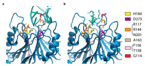 Position of the mutated residues on HducCdtB structure regarding DNA or lipid ligands. The HducCdtB catalytic domain is represented with two putative ligands, octameric DNA (a) or phosphatidylinositol-3,4-bisphosphate (b). H160: Yellow; D273: Purple; R117, R144, and N201: Orange; A163: Ochre; F156 and T158: Pink; G114: Red.