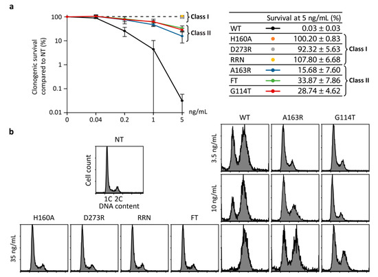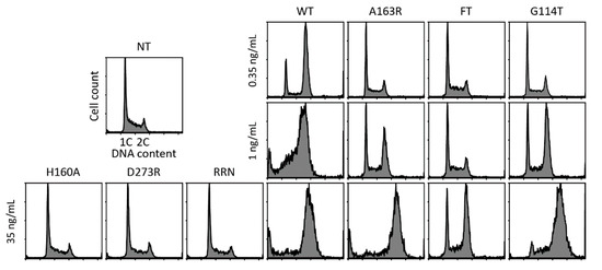 The purified WT and mutants CdtBs (Figure S2) were incubated with CdtA and CdtC subunits to reassemble active holotoxins [34]. The cytotoxic activity of these recombinant CDTs was assessed in HeLa cells by clonogenic assay after 10 days of treatment (Figure 2a). While the WT toxin induces a dose-dependent viability loss, with more than 99.9% cell death at 5 ng/mL, two classes of mutants emerged. The class I, composed by H160A, D273R, and RRN, is devoid of any cytotoxic activity at the highest toxin concentration. Besides, every single mutation from the RRN background confers the same defects as the triple mutant in the clonogenic assay, but also in all the other assays performed in this study (Figure S3). On the other hand, mutants potentially impaired in phosphatase activity, namely G114T, FT, and A163R, only displayed reduced cytotoxic activity compared to WT, defining the class II mutants. Then, cell cycle analyses were conducted after 36 h of exposure to 35 ng/mL of CDT. When incubated with the WT toxin, the vast majority of HeLa cells were blocked at G2/M (Figure 2b). Conversely, cells exposed to class I mutants exhibit the same cell cycle profile compared to untreated cells, confirming that these mutations abolished CdtB activity. Treatment with mutants from class II attenuated CDT-induced G2/M arrest for G114T and A163R, whereas FT did not cause obvious cell cycle defects under these conditions. At a lower toxin concentration of 3.5 ng/mL, only WT CDT was still able to impede cell cycle progression, at a level close to A163R at 35 ng/mL, indicating that class II mutants were at least 10-fold less active than WT in HeLa cells. Thus, our data suggest that similar to H160 catalytic residue, targeting residues involved in metal or DNA binding completely abrogates CdtB cytotoxic activity. Alternatively, mutation of residues possibly implicated in phosphatase activity partly alters CDT-mediated cellular defects.