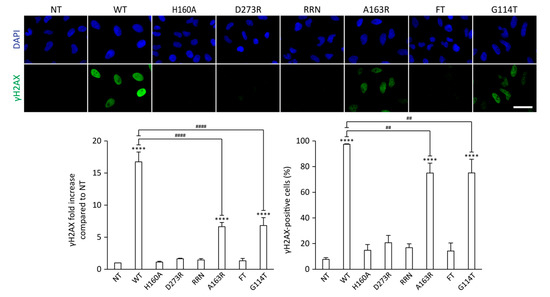 To further compare the defects associated to CdtB mutations, we evaluated their impact on DNA damage induction by monitoring γH2AX increase—a well-established DNA damage biomarker [56]—through immunofluorescence analysis, in HeLa cells treated for 24 h with 35 ng/mL of CDT (Figure 4 and Figure S5). The γH2AX signal was quantified individually in each cell, as previously described [34]. The WT CDT globally induced a strong 16,8-fold increase of the γH2AX signal compared to control cells, with almost all cells being damaged. In accordance with cytotoxicity analysis, class I mutants (H160A, D273R, and RRN) did not show any genotoxic effect. For class II mutants, A164R and G114T equally reduced the CDT-mediated γH2AX signal to approximately 40% of the WT. This implies that fewer cells accumulated detectable DNA damage, representing around 75% of the entire cell population. In the same way as the clonogenicity assay and cell cycle analysis, the toxin bearing the FT mutation was unable to increase the γH2AX signal under these conditions. Overall, class I mutations targeting catalytic, metal binding, or DNA binding residues completely inhibited the genotoxic and cytotoxic activities of HducCDT while A163R and G114T class II mutants only reduced them. Conversely, the FT mutant was unable, or more probably strongly impaired, in its capacity to induce DNA damage or cell cycle arrest while still retaining some cytotoxic activity. Taken together, these results indicate that HducCDT cytotoxicity correlates with CdtB nuclease activity. However, this also suggests that CDT-mediated DNA damage at least partly depends on residues potentially involved in CdtB phosphatase activity.