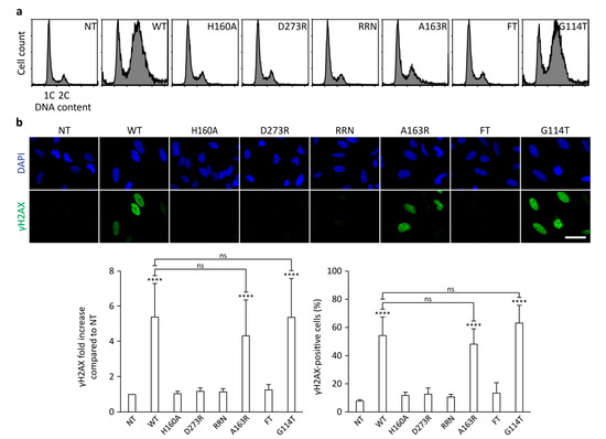 We speculated that CdtB transport from the host cell membrane to the nucleus may involve its phosphatase activity. In order to bypass the intracellular trafficking pathway that normally arises during CDT intoxination, CdtB has been directly delivered inside host cells in the absence of CdtA and CdtC [34]. HeLa cells were transfected with 1 µg/mL of recombinant CdtB for 36 h before cell cycle analysis (Figure 5a). Transfection of WT CdtB recapitulated the cell cycle defects observed when exposing cells to 3.5 ng/mL of WT holotoxin (Figure 2). Class I and FT mutants did not affect the cell cycle, whereas cells transfected with A163R exhibited a slight G2/M block. Interestingly, the cell cycle profile of cells transfected with G114T was the same as WT CdtB, demonstrating that this artificial CdtB delivery system restored the cytotoxic activity of G114T. The same strategy was then used for γH2AX immunofluorescence analyses (Figure 5b and Figure S6). After 24 h of transfection with 1 µg/mL of WT CdtB, HeLa cells exhibited an approximately 5-fold increase of γH2AX global signal or γH2AX-positive cells, compared to control or to cells transfected with class I or FT mutants. Interestingly, the A163R and G114T mutants were not significantly different from the WT. These data indicate that G114T, and to a lesser extent A163R, retrieved their capacity to induce DNA damage and cell cycle arrest when artificially introduced in host cells, in contrast to the holotoxin context. As these mutants are potentially defective in phosphatase activity, this supports that this activity could be important for CdtB trafficking. On the other hand, the FT mutant presents the very same defects, whether transfected alone or associated with CdtA and CdtC, suggesting it may be affected by other functions compared to other class II mutants.