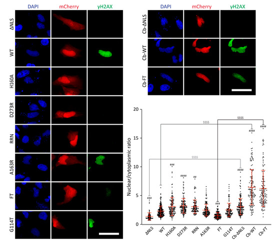 In order to determine whether CdtB defects associated with FT mutations could result from impaired subcellular localization, a direct expression strategy in host cells was conducted, ensuring an important amount of intracellular CdtB and massive but non-quantifiable DNA damage induction [34]. CdtB cDNAs were subcloned in mammalian expression plasmid in C-terminal fusion with mCherry before transfection in HeLa cells for 14 h. As a control for CdtB mislocalization, the previously characterized nuclear localization signal (NLS), corresponding to residues 114–124 [38], had been deleted (∆NLS mutant). According to the mCherry signal, the ∆NLS mutant exhibited a different sublocalization pattern compared to WT (Figure 6 and Figure S7). Indeed, while WT CdtB was normally enriched in the nucleus, the absence of NLS disturbed this nuclear import. Moreover, the intense γH2AX staining observed after WT CdtB expression was lost with ∆NLS. Class I mutants showed a strong nuclear enrichment but did not exert any genotoxic activity. Conversely, A163R and G114T mutants displayed normal subcellular localization and increased γH2AX signal similarly to WT, confirming that forcing CdtB entry in host cells through artificial routes alleviates the defects induced by A163 or G114 mutations. Interestingly, the nuclear localization of the FT mutant was impaired and close to ∆NLS. Moreover, DNA damage induction was also lower, as revealed by the clear γH2AX signal decrease, suggesting that the defects induced by these mutations could be attributable to CdtB mislocalization. To test this hypothesis, CdtB-mCherry was fused in the N-terminal position to the chromatibody (Cb), a camelid single-domain antibody specifically directed against the histone H2A/H2B heterodimer, ensuring nuclear enrichment and chromatin binding [57]. As shown with the ∆NLS mutant, adding the chromatibody relocated the protein to the nucleus, although without retrieving DNA damage induction. Chromatibody fusion to WT further increased CdtB nuclear fraction, without obviously affecting γH2AX staining. However, chromatibody fusion to FT greatly enhanced the nuclear localization to the chromatibody-WT level and restored γH2AX induction. Therefore, these data demonstrate that the FT mutation affects CdtB nuclear addressing, impeding the subsequent induction of genomic DNA damage.