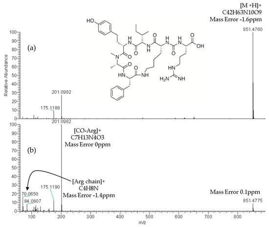 Product ion spectra of anabaenopeptin F (exact m/z of [M+H]+: 851.4774) detected in sample M1 (superficial scums) by LC–HRMS in the all ion fragmentation (AIF) acquisition mode at: 30 eV (a) and 70 eV (b).
