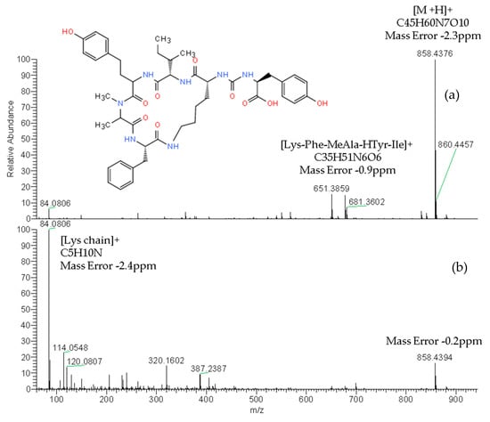 Product ion spectra of ocillamide Y (exact m/z of [M+H]+: 858.4396) detected in sample M1 (superficial scums) by LC–HRMS in the AIF acquisition mode at: 30 eV (a) and 70 eV (b).