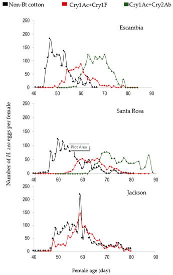 Cumulative effects on specific life-history traits of H. zea (i.e., larval survival and development time) impact the population growth potential on Bt cotton cultivars. The life table parameters indicated that H. zea populations tested are expected to grow when feeding on Cry1Ac+Cry1F or Cry1Ac+Cry2Ab Bt cotton, but with reduced growth rates (i.e., R0, rm). Overall, insects feeding on Cry1Ac+Cry1F and Cry1Ac+Cry2Ab are expected to generate 30% and 42% fewer individuals per day compared to non-Bt cotton, respectively. The growth potential of H. zea from Jackson county population was similar when feeding on non-Bt or on Cry1Ac+Cry1F, which could result in a higher number of exposed offspring [12]. However, the insects of the Jackson county had lower growth rates on non-Bt cotton compared with Escambia and Santa Rosa populations, indicating the presence of fitness costs [57] when they do not feed on Cry1Ac+Cry1F cotton. In a theoretical scenario where only Cry1Ac+Cry1F cotton is cultivated in the Florida Panhandle, the H. zea population from Jackson county is expected to produce in one generation 10–27% more females per female than the populations from Escambia and Santa Rosa. These differences between H. zea populations reinforce that resistance may develop because of local selection [58,59].