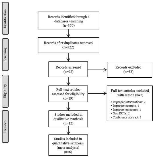 From the four databases that were searched, 370 records were identified, and 322 articles remained after duplicates were removed. After the titles and abstracts were screened, 72 articles remained; after the full-texts were reviewed, 12 RCTs [,,,,,,,,,,,] were included in this review. A flow chart of the study selection process, including the reasons for exclusion, is shown in Figure 1. Among the 12 RCTs, eight were conducted in South Korea [,,,,,,,], two in Egypt [,], one in France [], and one in Poland []. The number of participants ranged from 20 to 367. Four studies [,,,] were three-arm clinical trials, and one study [] included 1-year follow-up results for another study []. The treated conditions were Parkinson’s disease, low back pain, temporomandibular disorder (RDC/TMD Ia and RDC/TMD Ib), delayed onset muscle soreness, adhesive capsulitis, pelvic inflammatory disease, knee osteoarthritis, and polycystic ovary syndrome.