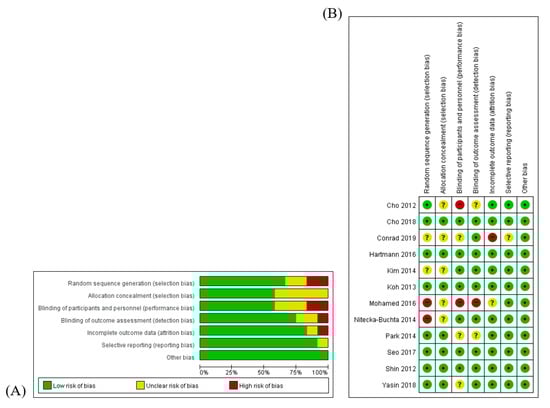 The quality of the included studies was assessed by the RoB tool, which consists of seven areas. Seven RCTs [,,,,,,] were blinded by using placebo BV, accordingly, the performance bias of those seven studies were assessed as ‘low’. The performance bias of the Yasin et al. study [] was determined as ‘unclear’ because that study was single-blinded. Since a random sequence with even or odd numbers was generated in the Mohamed et al. study [], the risk of selection bias of that study was determined to be ‘high’. There were no descriptions about blinding in the follow-up study; therefore, the risk of performance bias and risk of detection bias for Park et al. study [] were assessed to be ‘unclear’. The risk of attrition bias of the Conrad et al. study [] was determined to be ‘high’ because of the high drop-out rate. Additionally, a risk of other bias, such as that related to improper funding sources, did not exist. The RoB details are presented in Figure 2.
