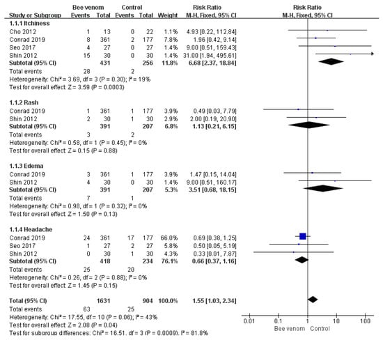 Adverse events were reported in six RCTs [,,,,,], and there were no safety issues in one study []. The remaining five studies did not mention adverse events. The most common symptoms caused by bee venom were skin reactions at the injection sites, including pruritus, rash, and swelling. Systemic symptoms such as headache, nasopharyngitis, and pain in an extremity were also reported. Regarding the meta-analysis results, only itchiness occurred significantly more often in the BV group than in the control group (risk ratio = 6.68, 95% confidence intervals: 2.37, 18.84, p < 0.0003, I2 = 19%). Detailed information on the adverse events is shown in Table 2 and Figure 3.