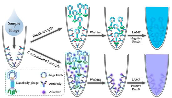 Schematic diagram of the immuno-loop-mediated isothermal amplification (iLAMP). Anti-aflatoxin mAb 1C11 was first coated on the bottom of a polymerase chain reaction (PCR) tube which had been treated with glutaraldehyde. Then, the sample extract and anti-idiotypic nanobody-phage V2–5 were added to the tube simultaneously. Since the nanobody-phage could mimic the antigen (aflatoxin) in the immunoreaction, there was a competition between the phage and aflatoxin in binding with mAb 1C11. After the reaction, the unbound phages were moved out of the tube via the washing step. Subsequently, the LAMP solutions were added to the tube for amplification. The color of the mixture in the tube remained violet (positive result) if the sample contained aflatoxin, otherwise it turned sky blue (negative result).