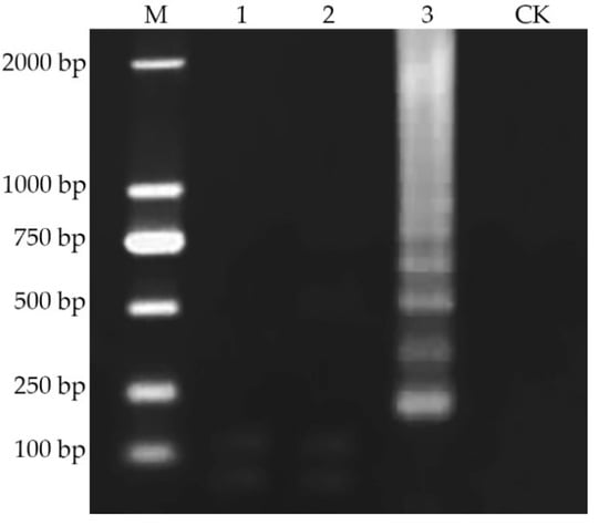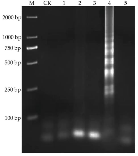 In order to evaluate the specificity of the LAMP reaction, the helper phage M13KO7, the anti-aflatoxin scFv phage 1A7 [] and the phage V2–5 were selected as templates for LAMP reaction, and ddH2O instead of the template was used as the negative control. Each amplification product was subjected to 2% agarose gel electrophoresis (Figure 4). The results showed that only the nanobody-phage V2–5 produced trapezoid bands, while the other three phages did not, indicating that the primers have good specificity and can be used for the specific LAMP reaction of nanobody phage V2–5.