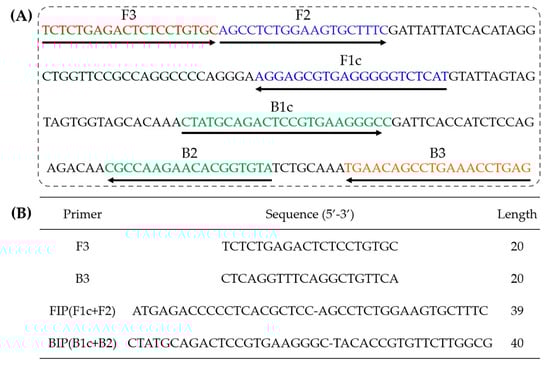 (A) Nucleotide sequence of phage V2–5 used to design LAMP primers. The locations and binding sequences of the primers are indicated by arrows and different colors. (B) Information of the fourth set of LAMP primers, a forward inner primer (FIP) consisting of F1c and F2, a backward inner primer (BIP) consisting of B1c and B2, a forward outer primer (F3) and a backward outer primer (B3).