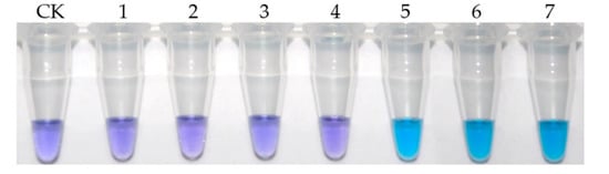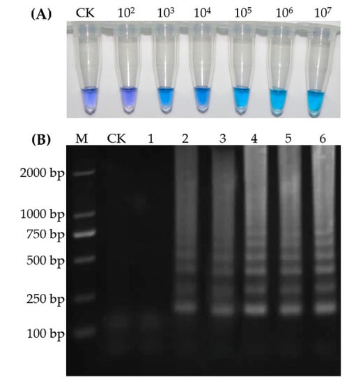 By adding an indicator to the LAMP system, the detection results can be identified by the naked eye easily. The indicator used in this study was hydroxy-naphthol blue (HNB), a metal ion indicator. When HNB was first added to the reaction system, the color of the mixture was violet; during the reaction, Mg2+ combined with the pyrophosphate ion, a by-product of LAMP, to form magnesium pyrophosphate precipitation; meanwhile, the color of the mixture changed from violet to sky blue with the decrease of Mg2+ concentration. In order to investigate whether the visual results were consistent with those of DNA gel electrophoresis, phage V2–5 was diluted into concentration gradients of 102, 103, 104, 105, 106 and 107 pfu/mL, and detected by LAMP, respectively. The visual results are shown in Figure 5A, and the DNA gel electrophoresis results are shown in Figure 5B. The detection limits of phage V2–5 obtained by the two methods were both 103 pfu/mL. Therefore, the visual detection method can be used instead of DNA gel electrophoresis to simplify the detection process.