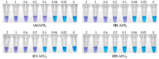 A series of concentrations (2, 1, 0.4, 0.2, 0.1, 0.04 and 0.02 µg/kg) of aflatoxin standards were prepared in 10% methanol/PBS (v/v) and detected by the iLAMP method. The color change of the tubes was observed with the naked eye. As shown in Figure 6, with the decrease of aflatoxin concentration, the color of the tubes gradually changed from violet to sky blue. The lowest concentration of aflatoxin under violet color was taken as the visual detection limit for iLAMP. Therefore, the visual detection limits of iLAMP for AFB1, AFB2, AFG1 and AFG2 were 0.1, 0.1, 0.2 and 1 µg/kg, respectively.