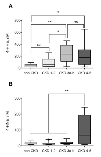 2.2. Plasma Concentration of 4-hydroxy-alkenals Increases in Patients with Severe Loss of Kidney Function