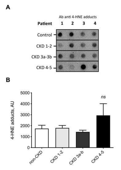 It is known that 4-HNE and 4-HHE are prone to react with proteins to form covalent adducts [10]. We therefore used specific antibodies directed against Michael adducts of 4-HNE and 4-HHE to detect covalent adducts on plasma proteins using immunoblotting (i.e., dot blot). Regardless of CKD stage, CKD patients exhibited an increased level of 4-HHE adducts on plasma proteins (Figure 3A,B). The level of 4-HHE protein adducts was 115 (92–147) arbitrary unit (AU) in non-CKD subjects and 1093 (587–3984) AU in patients with CKD (Mann–Whitney U test, p < 0.005), i.e., a 9.5-fold increase. Surprisingly, no difference was noticed in 4-HNE protein adducts (1617 (1129–2501) and 1863 (1450–2524) AU for non-CKD and CKD patients, respectively (Figure 4).