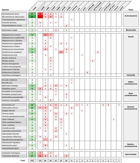 Type II toxin–antitoxin (TA) systems identified in human pathogenic bacteria according to the toxin family classification system [,] as collected in the Toxin–Antitoxin Database (TADB) 2.0 []. The number given for an individual species is the sum of the values for all strains of a given taxon. This list was manually curated to represent strains and/or species frequently associated with infections in humans (including opportunistic pathogens).