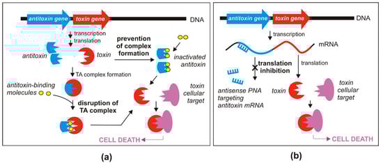 Proposed antibacterial strategies based on the direct activation of toxins of TA systems; (a) disruption of the protein toxin and antitoxin complex and/or prevention of protein complex formation; (b) inhibition of antitoxin translation (see text for details).