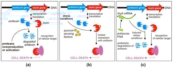 The depletion of antitoxin molecules results in the liberation of the toxin proteins from TA complexes and relieves transcriptional repression of TA operons, causing increased production of TA transcripts. These events alter the stoichiometry of TA molecules in a cell and ultimately have a lethal effect []. Therefore, increasing the level of cellular proteases or designing specific molecules that activate these proteases could be a promising strategy for the indirect activation of toxins (Figure 3a).